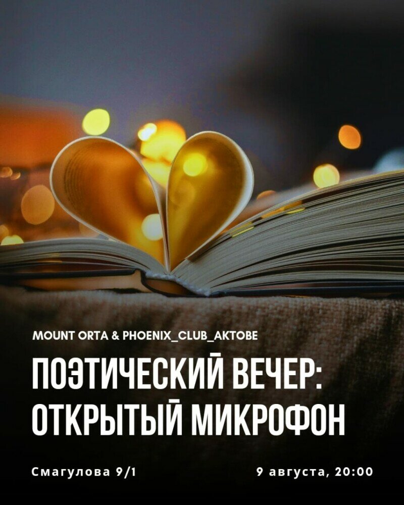 Mount Orta и Phoenix_club_aktobe приглашают всех, кто пишет, поёт, играет и просто любит живую поэзию и музыку, на вечер открытого микрофона!