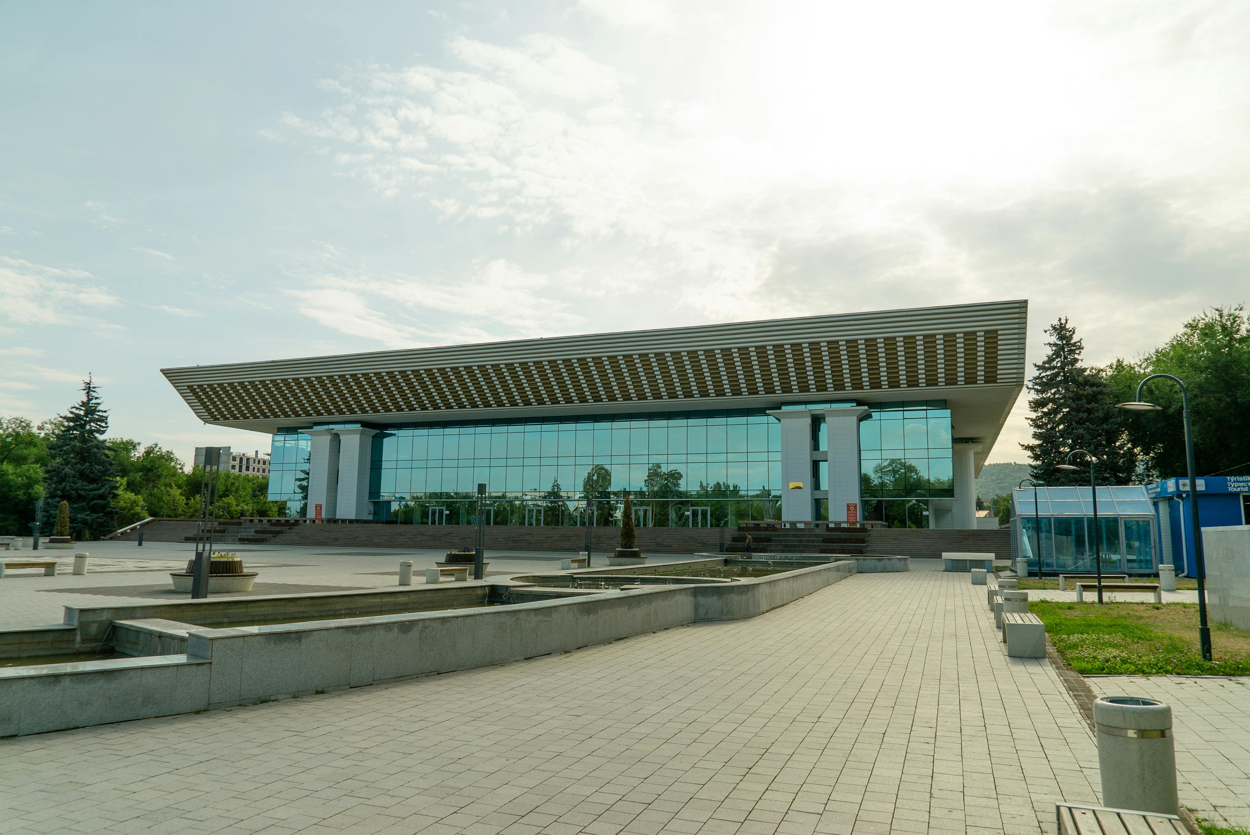 Здание было построено по типовому проекту из железных блоков, но со сплошным витражом, что немало удивило алма-атинцев – тогда для горожан стеклянные фасады были новшеством. Фойе украшало панно «Национальные игры», которого впоследствии ждала нелегкая судьба: его заменили копией, вынесли наружу, затем оно и вовсе утратилось. Однако в годы реконструкции было обнаружено, что панно зашито гипсокартоном. Сейчас его снова вернули к жизни.