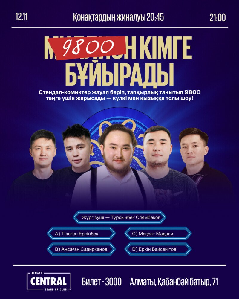 Стендап комиктер сұрақтарға жауап беріп немесе тапқырлық танытып 10 000 теңге ұтып алуға тырысады. Бұл күлкілі әрі ақпараты мол шоуды көрген де арманда, көрмеген де арманда!