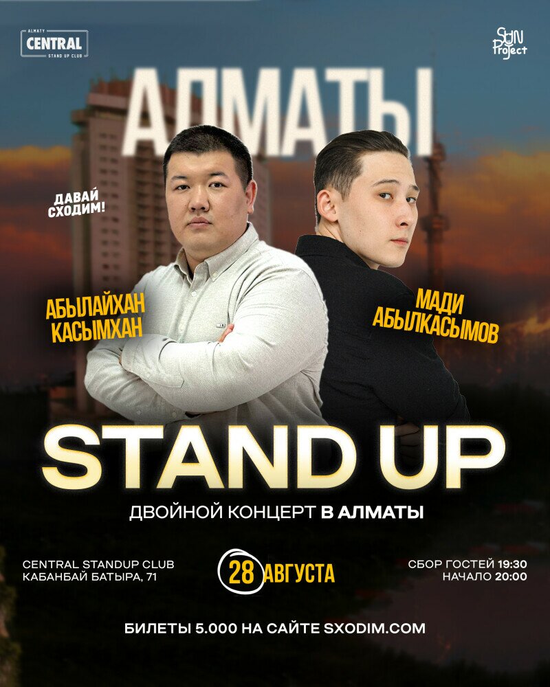 Два комика из стендап-команды SUN project выступят с двойным концертом в Алматы. Это вечер авторского юмора, где каждый из них представит свою часть выступления перед живой аудиторией.