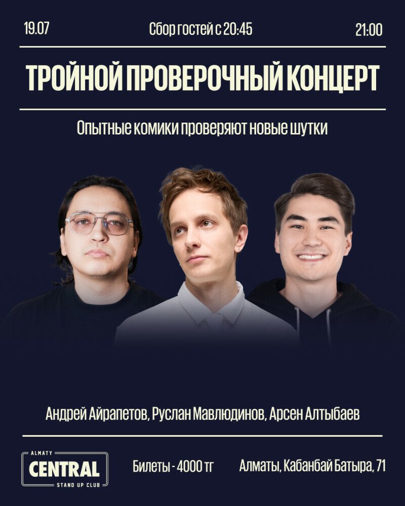 У нас три комика — и каждый приедет проверить на тебе свежий, только что написанный материал. Ты поможешь им понять — что заходит, а что нет. Это не YouTube-запись, это чувство, когда ты в эпицентре разговора — вместе смеётесь, иногда молчите, и чувствуете, как идеи улетают в живой зал.
