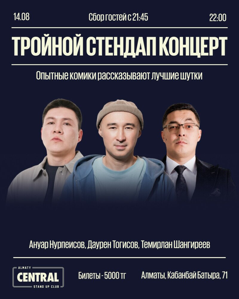 Ануар Нурпеисов, Даурен Тогисов и Темирлан Шангиреев выходят на одну сцену, чтобы провести вечер с лучшими шутками из своего репертуара. Три опытных комика, три разных стиля и один концерт, наполненный юмором и живым взаимодействием с залом.