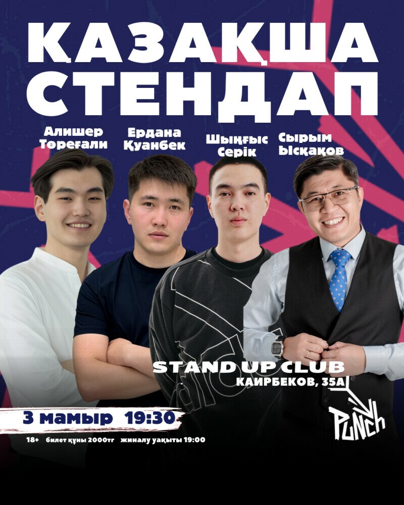 Тәжірибелі комиктер күнделікті жағдайларды өз көзімен көрсетіп, сізді күлкіге қарық қылады. Бұл — өзіңді танитын, кейде өзіңе күлетін, кейде «дәл мен ғой» дейтін кеш.