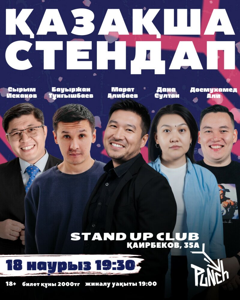 Жақын сахнасы, жайлы атмосферасы, дәмді асханасы мен бары бар Punch Stand-Up Club-та кездесеміз.