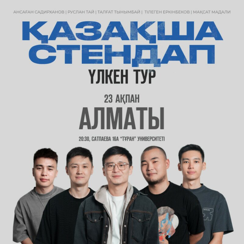 Қазақша стендап өнерінің жарқын өкілдері Аңсаған Садирханов, Руслан Тай, Тілеген Еркінбеков, Талғат Тынымбай және Мақсат Мадали үлкен турға шығады!