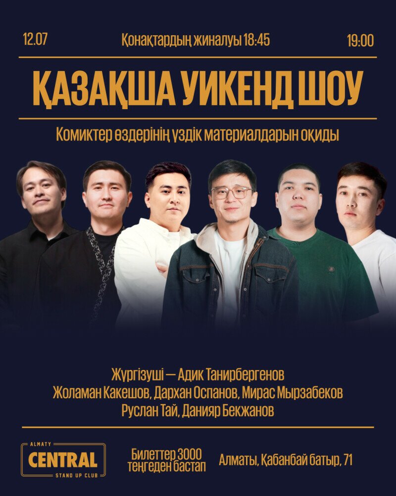 Бұл іс-шара тек көңіл көтеру мақсатында жасалып отыр. Ешкімді ренжіту, қорлау немесе жынына тию мақсатын алдына қойып отырған жоқ. Сахнадан айтылған сөздерді тек әзіл ретінде қабылдауларыңызды сұраймыз. Билет сатып ала отырып, төменде көрсетілген шарттармен толық келісетініңізді растайсыз.