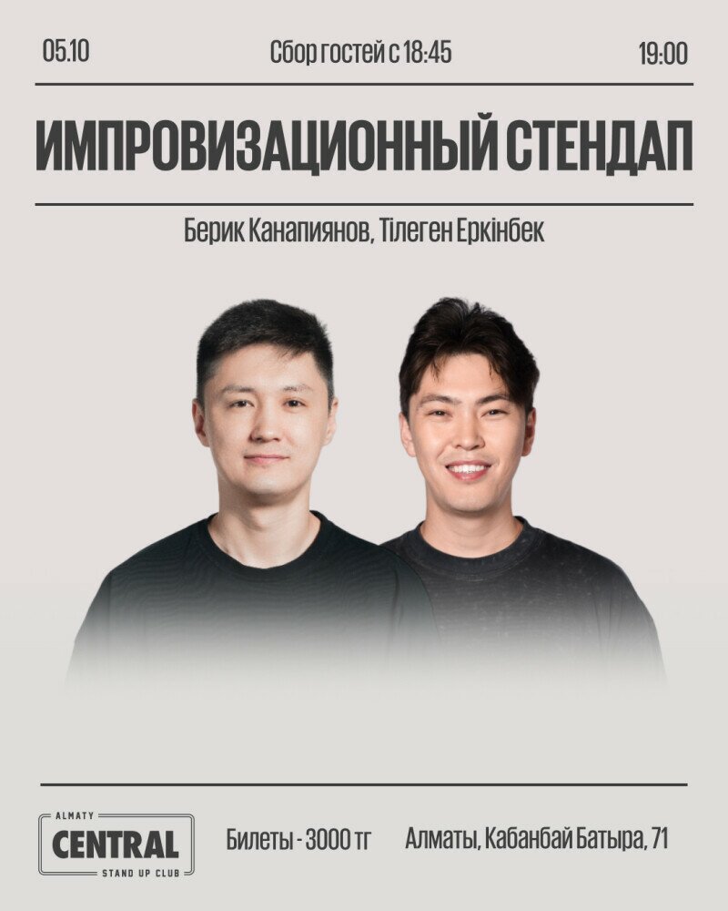 На сцене Almaty Central Stand up club выступят Берик Канапиянов и Тілеген Еркінбек в рамках импровизационного стендап-концерта!