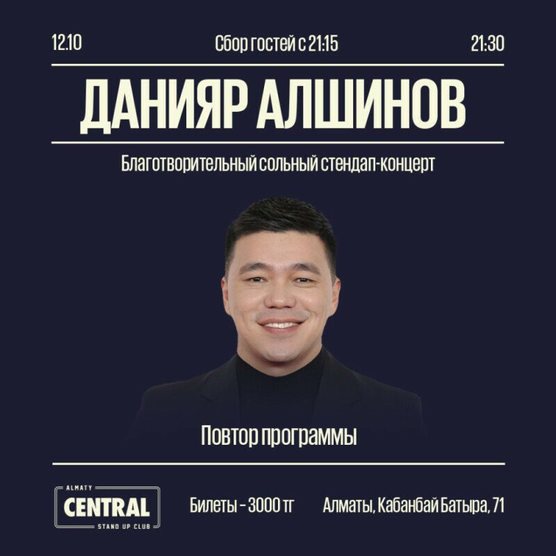 Не упустите возможность окунуться в вихрь смеха с Данияром Алшиновым на его сольном стендап концерте!