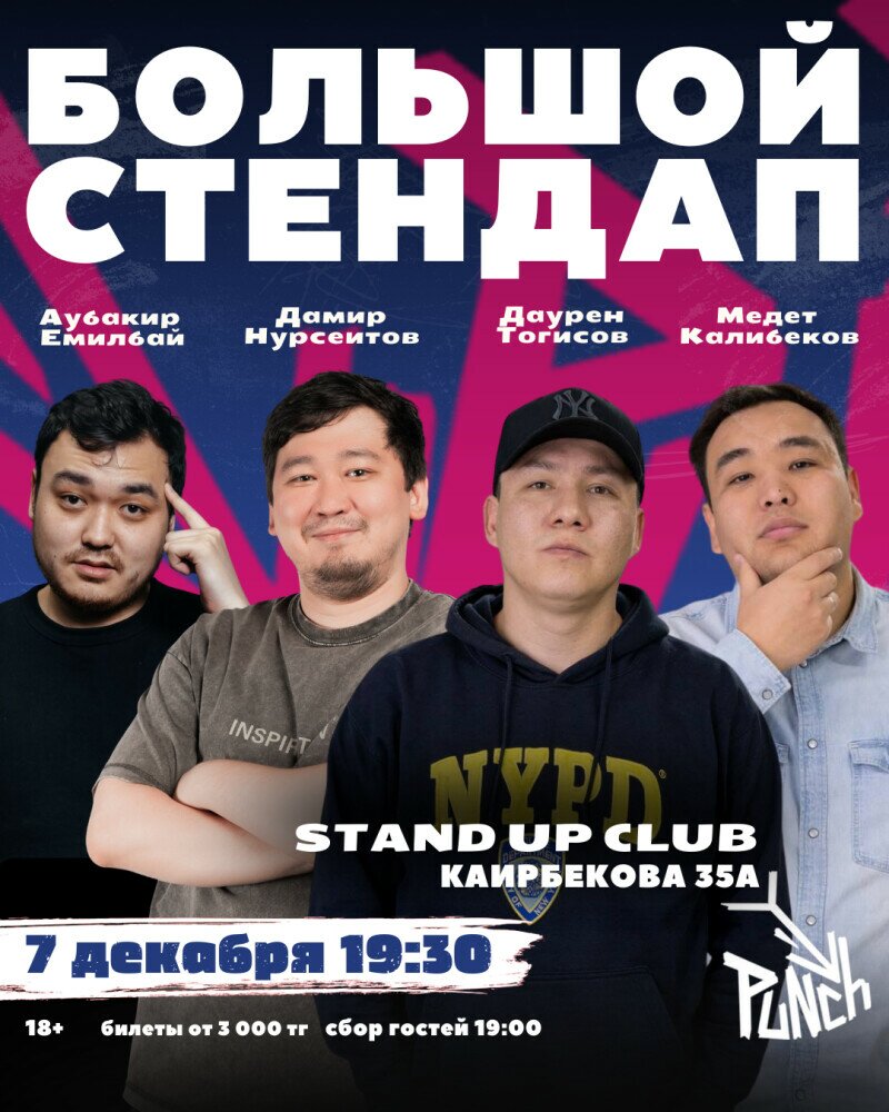 Аубакир Емилбай, Медет Калибеков, Даурен Тогисов и Дамир Нурсеитов соберутся в Punch, чтобы выдать свои лучшие шутки, новые истории и неожиданные импровизации. Вас ждёт вечер настоящего стендапа без лишнего шума — только комики, микрофон и честный смех.