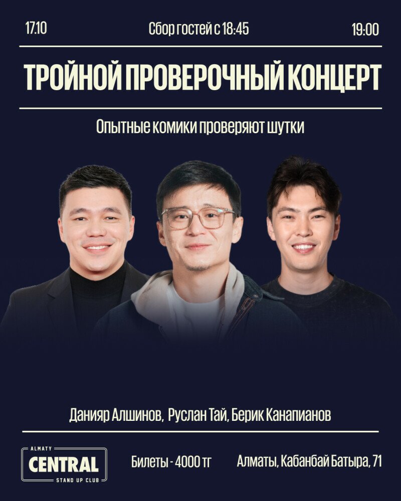 Данияр Алшинов, Берик Канапиянов и Руслан Тай выходят на одну сцену, чтобы провести вечер с лучшими шутками из своего репертуара. Три опытных комика, три разных стиля и один концерт, наполненный юмором и живым взаимодействием с залом.