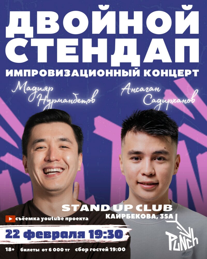 В этот вечер Мадияр Нурманбетов и Ансаган Садирханов выходят на сцену без сценария — только микрофоны и ваши идеи.