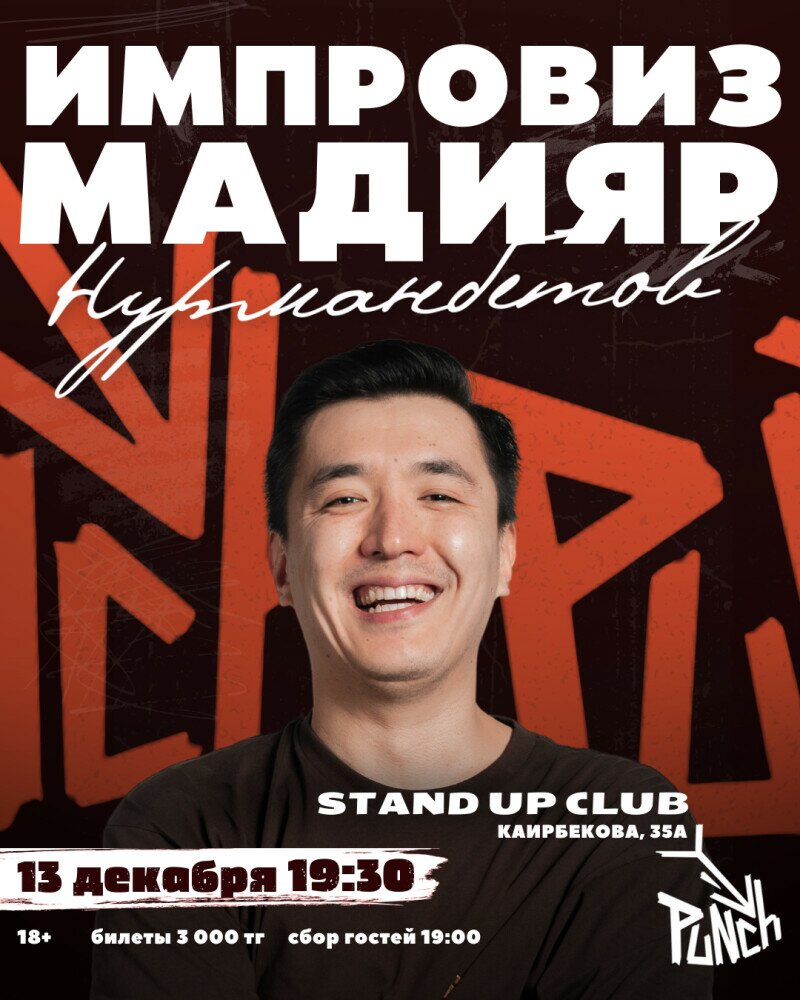Мадияр Нурманбетов устроит импров-концерт, где каждое ваше слово и любая случайная мысль могут стать началом самой смешной истории. Полный хаос, быстрая реакция и настоящий стендап-импров в лучшем виде — только один вечер и только здесь.