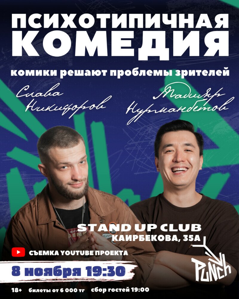 Психотипичная комедия — это интерактивное шоу, где гости делятся своими ситуациями, а Слава и Мадияр отвечают на них с юмором и дерзостью. Без гарантий решений , но со смехом, импровизацией и неожиданными советами — каждый уходит с улыбкой.