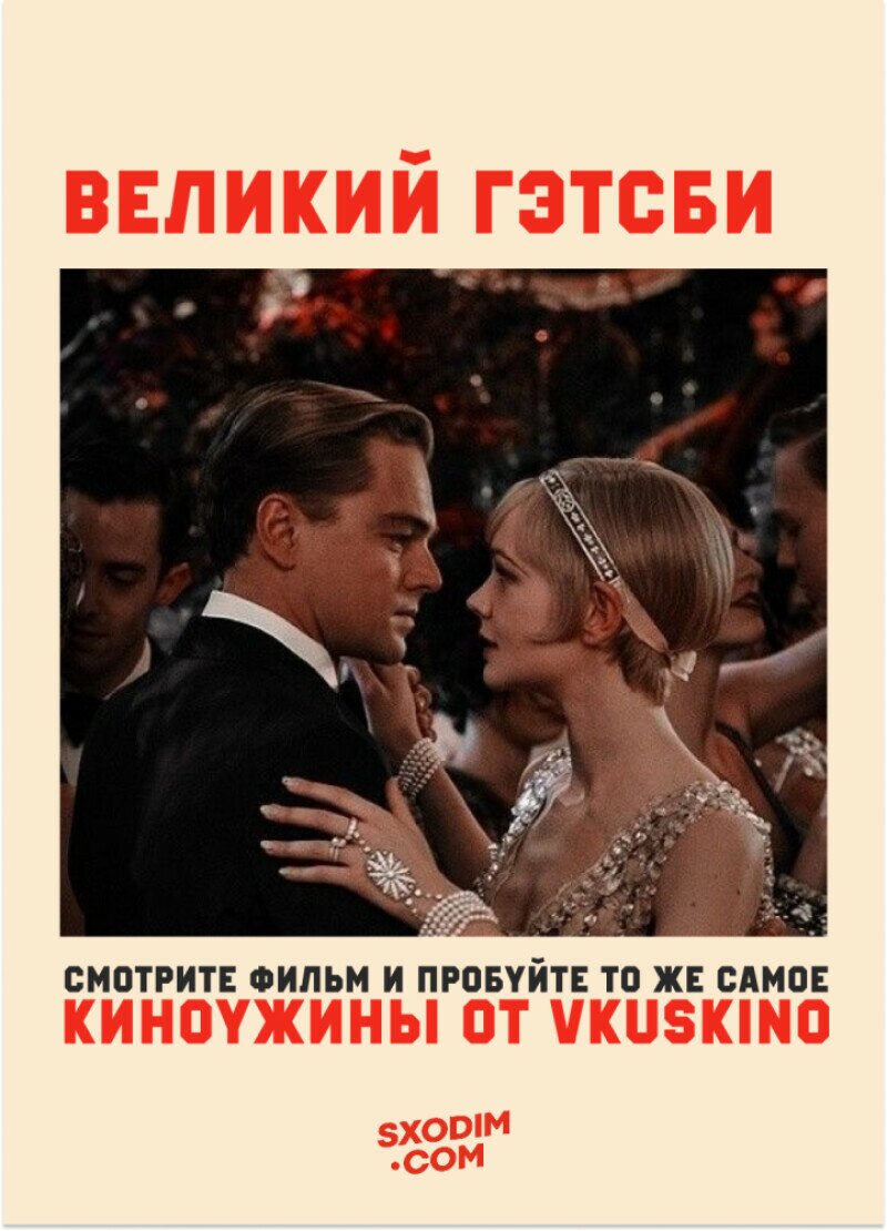 Киноужин с «Великим Гэтсби» — это иммерсивный гастрономический опыт, где блюда и напитки появляются в точной синхронизации с ключевыми сценами фильма. Вкусы, подача и атмосфера усиливают эмоции кадра и погружают в эпоху джаза, роскоши и иллюзий.