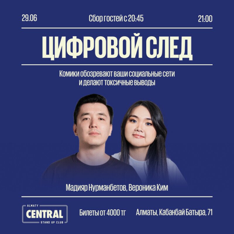 Задумывались ли Вы, как выглядит Ваша страница в социальной сети для посторонних людей и какие выводы можно сделать о Вас на её основе? Приходите на «Цифровой след», шоу, в котором профессиональный хейтер Мадияр Нурманбетов расскажет Вам всю правду о Вас самих!