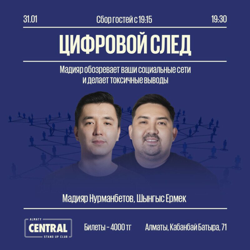 Задумывались ли Вы, как выглядит Ваша страница в социальной сети для посторонних людей и какие выводы можно сделать о Вас на её основе? Приходите на «Цифровой след», шоу, в котором профессиональные хейтеры Мадияр Нурманбетов и Шынгыс Ермек расскажут Вам всю правду о Вас самих!