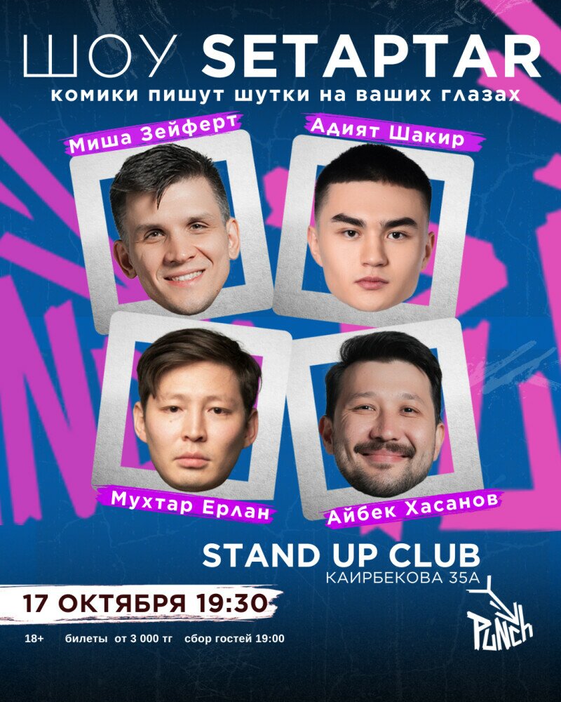 Сетаптар – уникальное шоу, в котором комики объединяются, чтобы поделиться своими идеями, зарисовками и наблюдениями, «разгоняя» их до цельной и смешной шутки. Проведи вечер в смешной компании, в атмосфере нашего уютного стендап клуба.