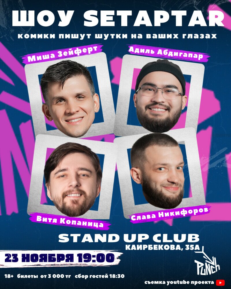 «Сетаптар» — вечер, где комики приносят на сцену только самое новое и самое смешное. Миша Зейферт, Слава Никифоров, Виктор Копаница и Адиль Абдигапар выйдут со свежими сетапами, которые вы услышите первыми. Атмосфера настоящего стендап-клуба — тёплый свет, близкая сцена, живой смех и чувство, что всё происходит здесь и сейчас.
