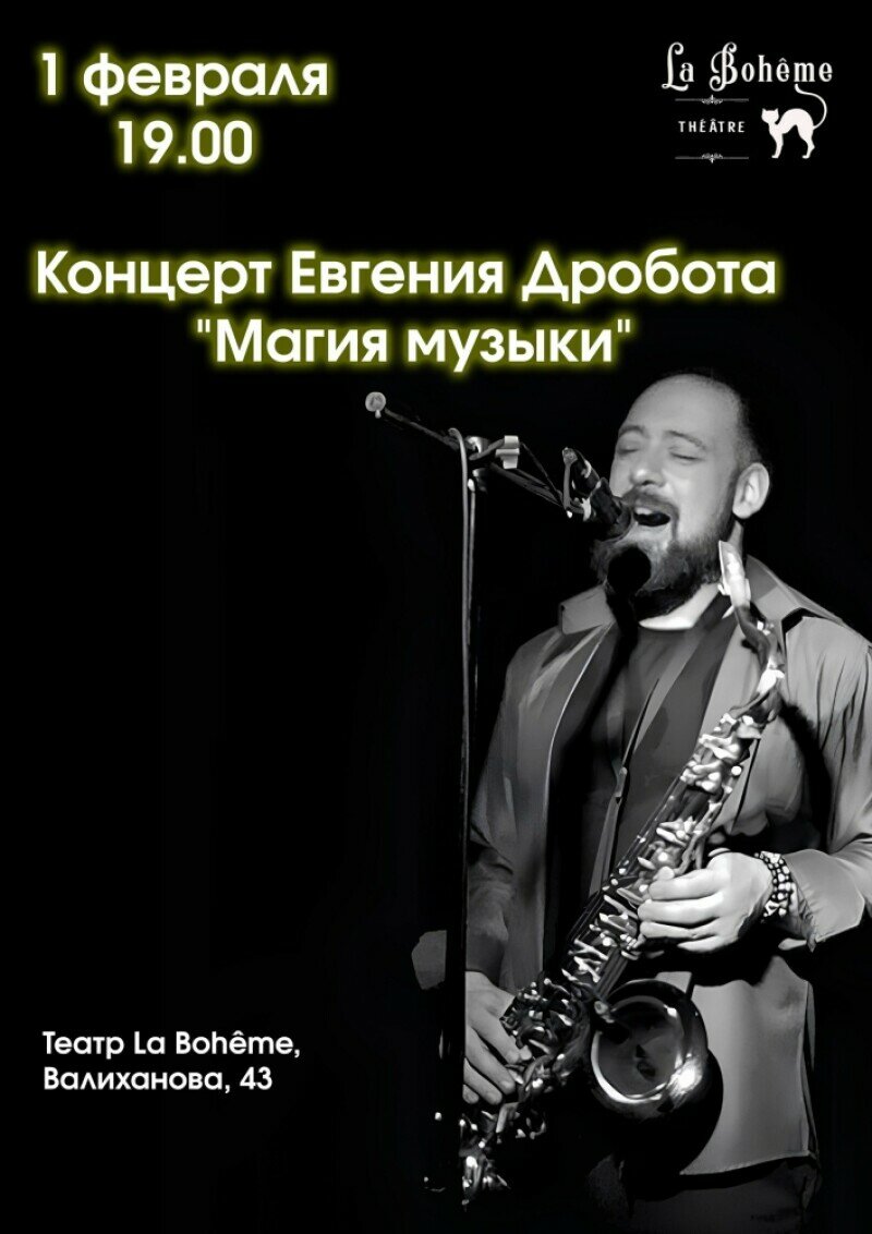 Театр La Bohême приглашает вас на концерт Евгения Дробота «Магия музыки». В этот вечер особенно уютно и тепло — потому что на сцене Евгений Дробот: саксофонист, оперный исполнитель и человек, с которым музыка звучит по-настоящему живо.