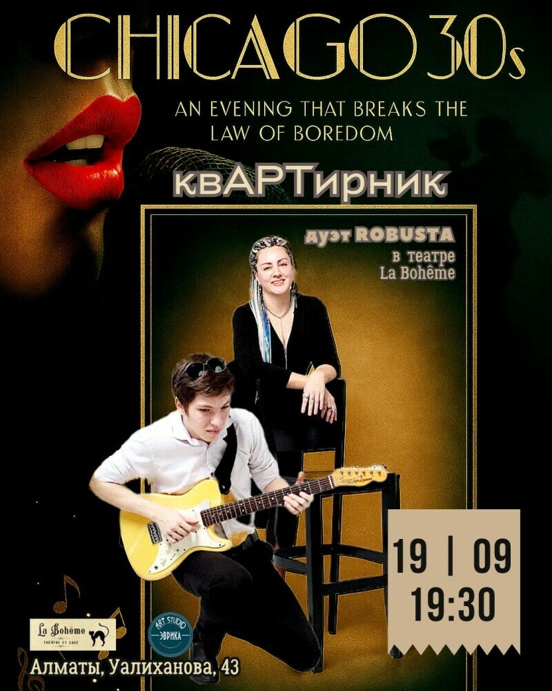 Дуэт Robusta подарит путешествие в легендарный Чикаго 30-х: стильные аранжировки известных хитов, элегантный вокал, живые гитарные рифы и энергия, которая пробирает до мурашек.