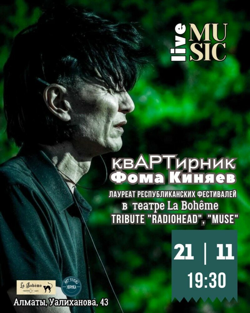21 ноября в театре La Bohême — квартирник Фомы Киняева, лауреата республиканских фестивалей. В этот вечер прозвучит трибьют легендам — Radiohead и Muse.