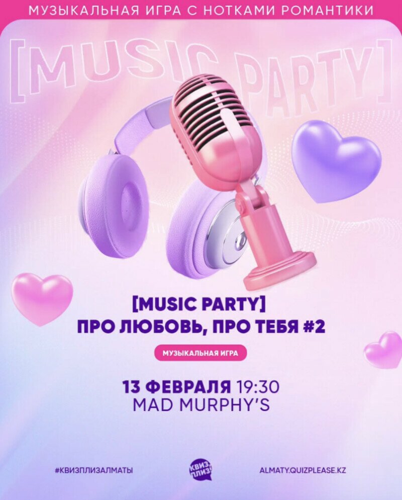 What is love? Ответим на этот вопрос все вместе на самой романтичной [music party]. Вас ждут целых 8 раундов с треками про любовь, ну мёд, не иначе. А ещё эта игра — прекрасный вариант для первого свидания. И второго, и третьего... А можно и не для свидания, вы, главное, приходите. Вдруг ваша судьба поджидает вас именно на Квиз, плиз!? В общем, в любом случае регайтесь, а там разберётесь.