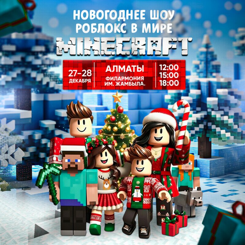 Погрузитесь в яркое, интерактивное и полностью лицензионное новогоднее шоу, где герои Roblox неожиданно оказываются в кубическом мире Minecraft! Вас ждёт сказочное приключение с любимыми персонажами, захватывающими моментами и атмосферой настоящего праздника.