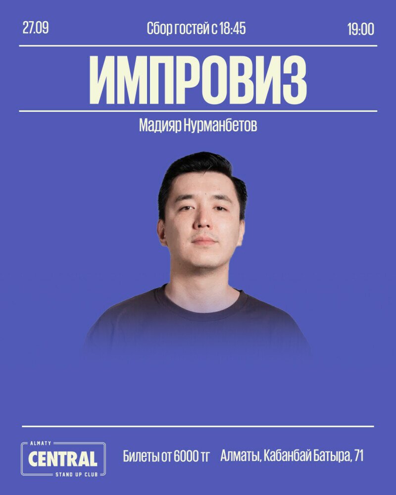 На сцене Almaty Central Stand up club выступит Мадияр Нурманбетов в рамках импровизационного стендап-концерта!