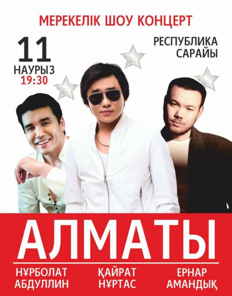 11 наурыз күні Республика Сарайы қала тұрғындары мен қонақтарын үлкен мерекелік концертке шақырады. Кеш ерекше атмосфераға толы болмақ: сахнада қазақстандық эстраданың ең жарқын жұлдыздары өнер көрсетіп, өздерінің ең үздік хиттерін орындап, көрермендерге керемет көңіл күй сыйлайды.