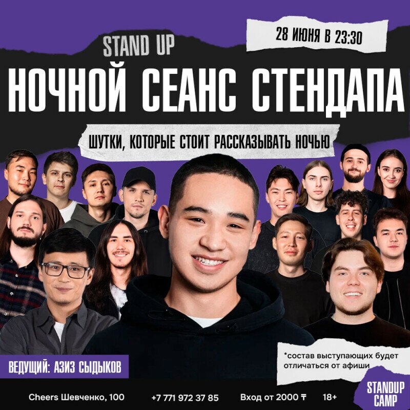 На сцене выступит 7 опытных и перспективных комиков Алматы, имена которых мы держим в секрете. Кто именно выступит — узнаете только на самом мероприятии.