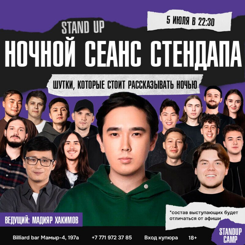 На сцене выступит 7 опытных и перспективных комиков Алматы, имена которых мы держим в секрете. Кто именно выступит — узнаете только на самом мероприятии.