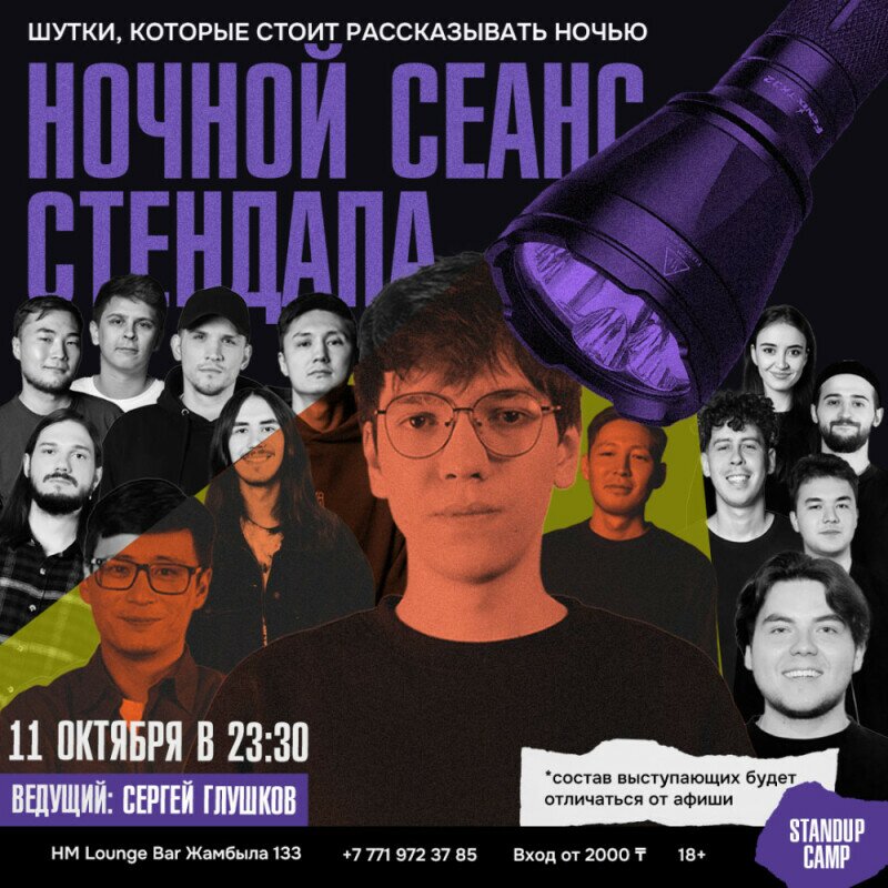 На сцене выступит 7 опытных и перспективных комиков Алматы, имена которых мы держим в секрете. Кто именно выступит — узнаете только на самом мероприятии.