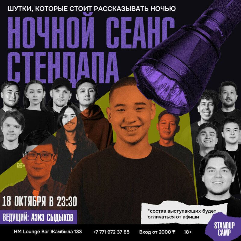 На сцене выступит 7 опытных и перспективных комиков Алматы, имена которых мы держим в секрете. Кто именно выступит — узнаете только на самом мероприятии.