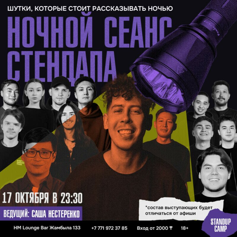 На сцене выступит 7 опытных и перспективных комиков Алматы, имена которых мы держим в секрете. Кто именно выступит — узнаете только на самом мероприятии.