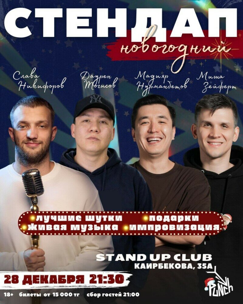 На сцене — Слава Никифоров, Даурен Тогисов, Мадияр Нурманбетов и Миша Зейферт — четыре комика, чьи выступления не нуждаются в представлении.