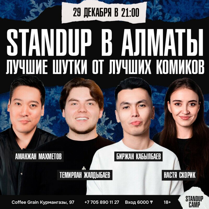 В преддверии Нового года алматинские комики расскажут лучшие шутки, создавая незабываемую атмосферу!