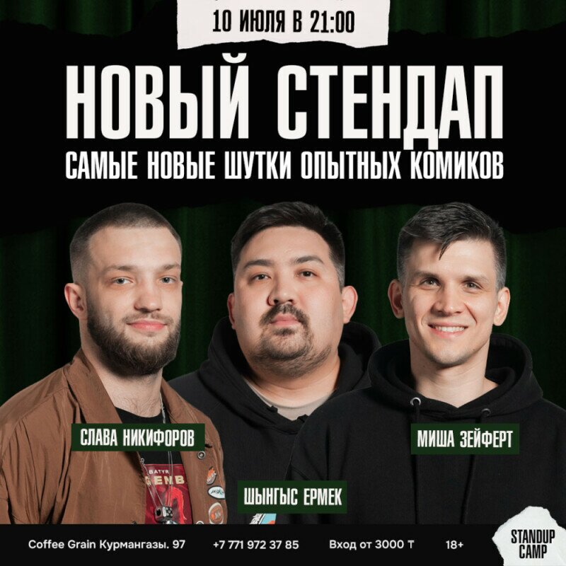 На сцене выступят опытные стендап-комики: Слава Никифоров, Шынгыс Ермек, Миша Зейферт.