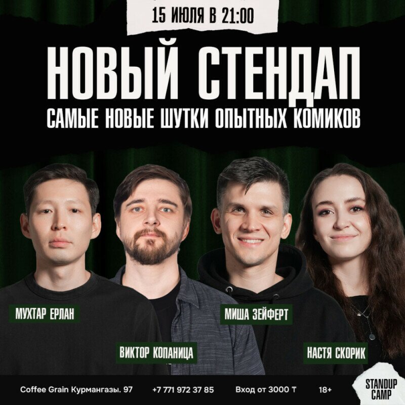 На сцене выступят опытные стендап-комики: Мухтар Ерлан, Виктор Копаница, Миша Зейферт и Настя Скорик. Они расскажут новый материал, тот, что они написали совсем недавно.