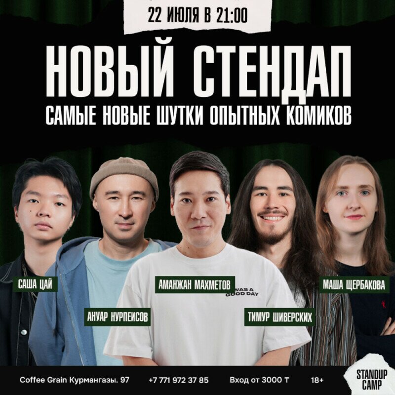 На сцене выступят опытные стендап-комики: Саша Цай, Ануар Нурпеисов, Аманжан Махметов и Тимур Шиверских