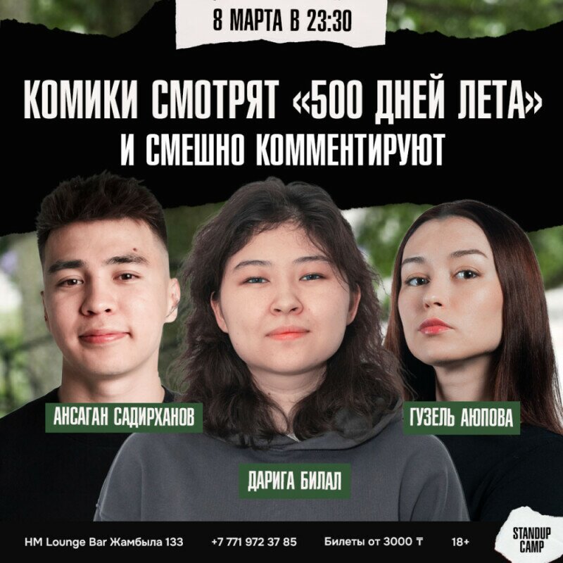 Смотреть «500 дней лета», обсуждать и делать комедийные наблюдения с вами будут Ансаган Садирханов, Дарига Билал и Гузель Аюпова