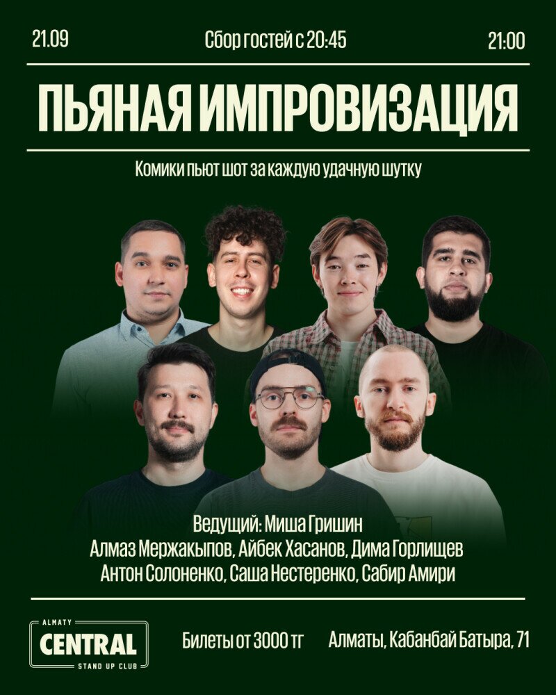 Комики пьют шот за каждую зашедшую шутку. Но прежде: лучшие импровизаторы города делятся на 2 команды, а победителя выбирают зрители. Будет интересно и несомненно смешно!