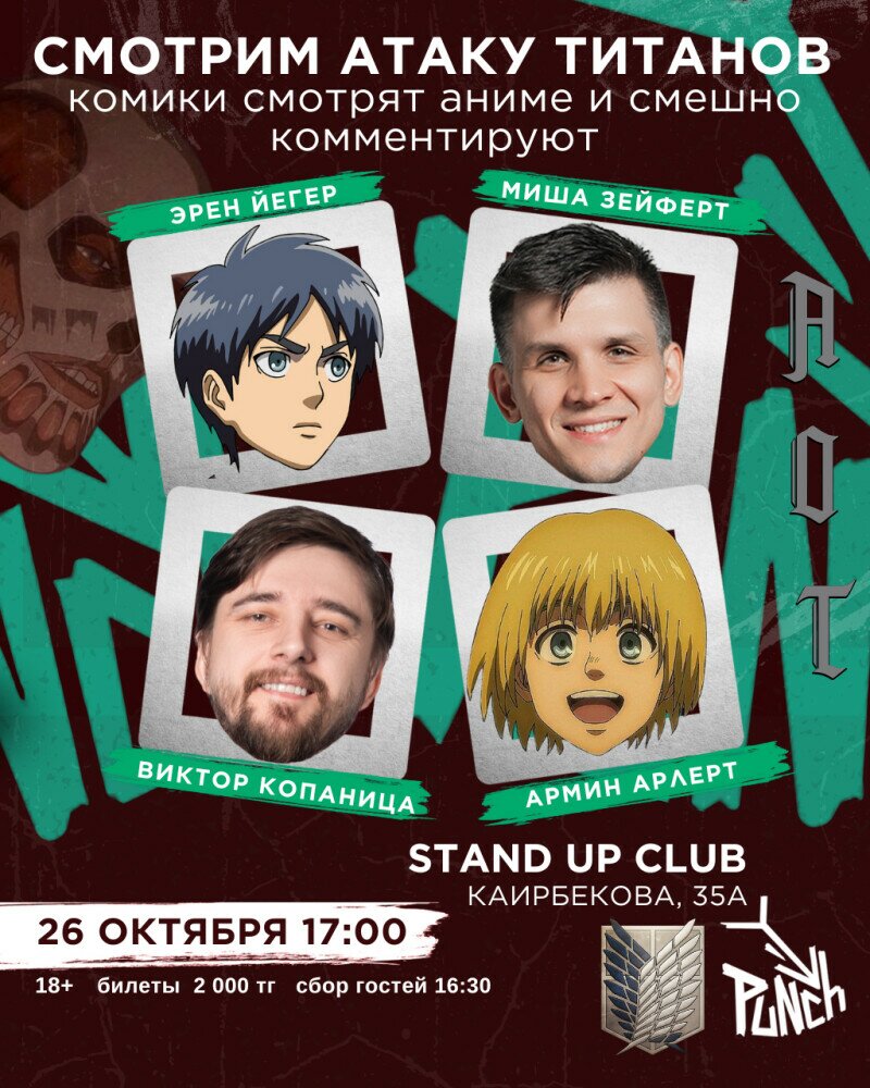 Смотрим Атаку Титанов - шоу, где комики смотрят Attack on Titan и шутят вслух. Эпичные сцены превращаются в абсурдные сравнения, драма — в стендап, а даже тем, кто не видел аниме, будет смешно и понятно. И всё это в уютном стендап клубе Punch кухней и баром, где готовят потрясные бургеры.