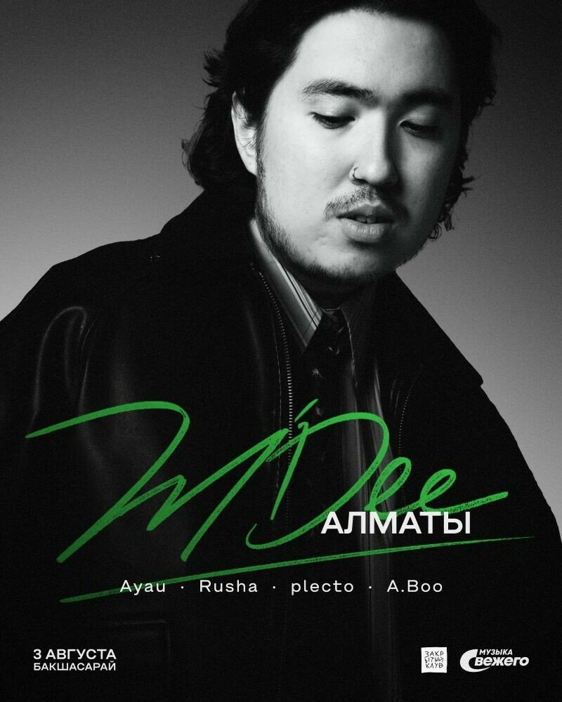 В Алматы состоится сольный концерт M’Dee. Вы сможете услышать новый альбом артиста «Алматинский джаз, Vol. 3», а так же любимые хиты в сопровождении лайв бенда. Приглашенные артисты: Ayau, Rusha, A.Boo, plecto.