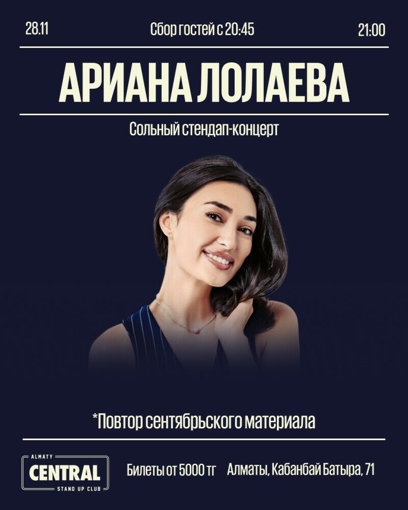 Ариана Лолаева – стендап-комикесса, участница шоу «Открытый микрофон», «Comedy Баттл», «Стендап Андеграунд», экс-резидентка Stand Up Club #1 выступит со своим материалом в Алматы!
