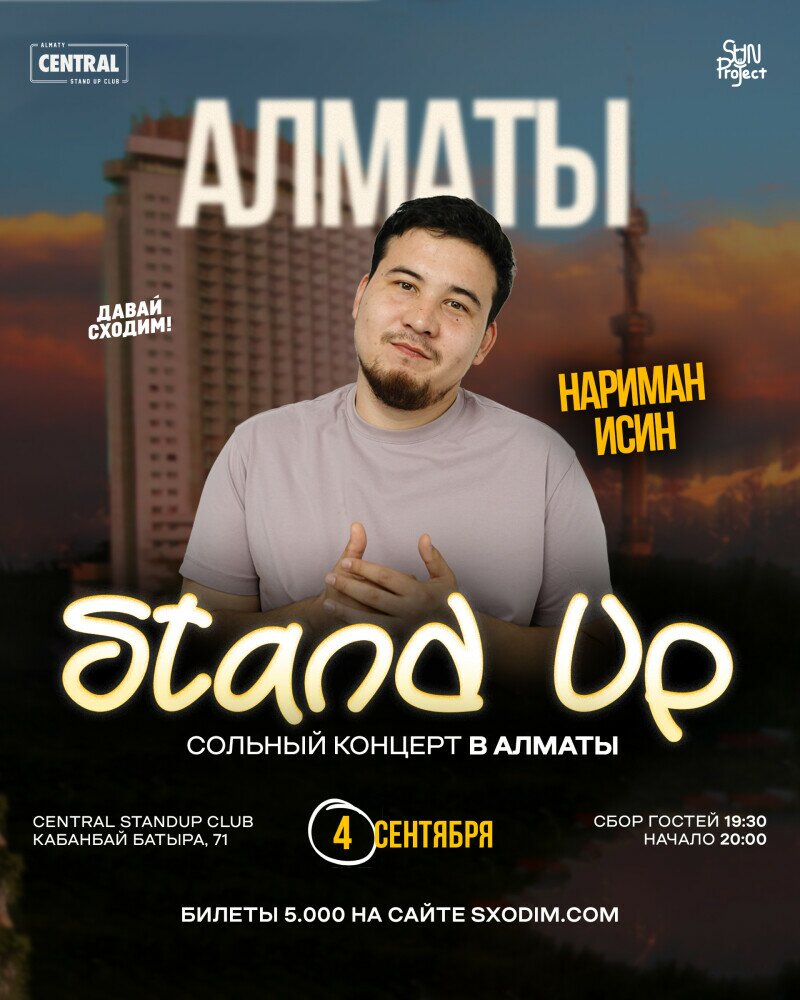 Участник SUN project Нариман Исин представит своё сольное выступление. Это полноценный стендап-концерт с личными историями, актуальными темами и живым залом.