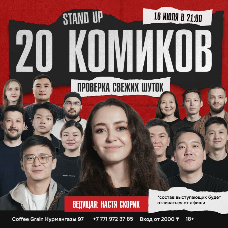 На одной сцене за вечер выступят 20 комиков и каждый принесет вам свой взгляд, стиль и свежие шутки.
