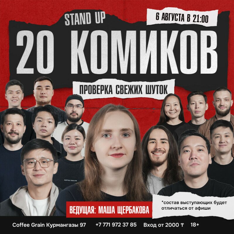 На одной сцене за вечер выступят 20 комиков и каждый принесет вам свой взгляд, стиль и свежие шутки.