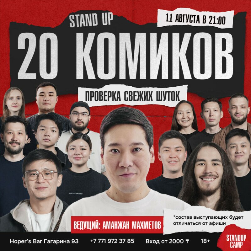 На одной сцене за вечер выступят 20 комиков и каждый принесет вам свой взгляд, стиль и свежие шутки.