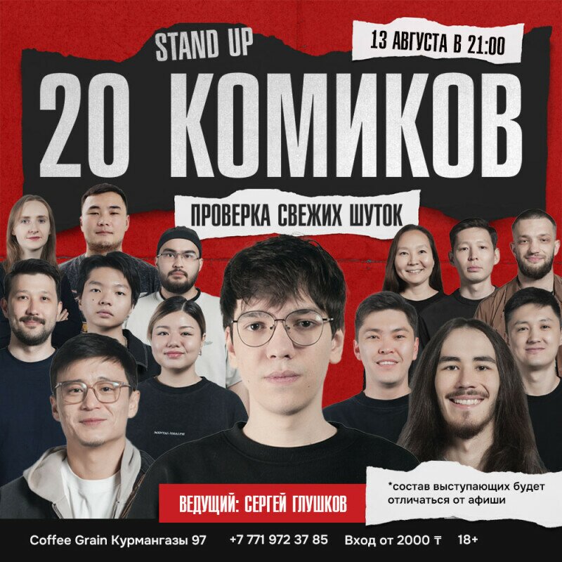 На одной сцене за вечер выступят 20 комиков и каждый принесет вам свой взгляд, стиль и свежие шутки.