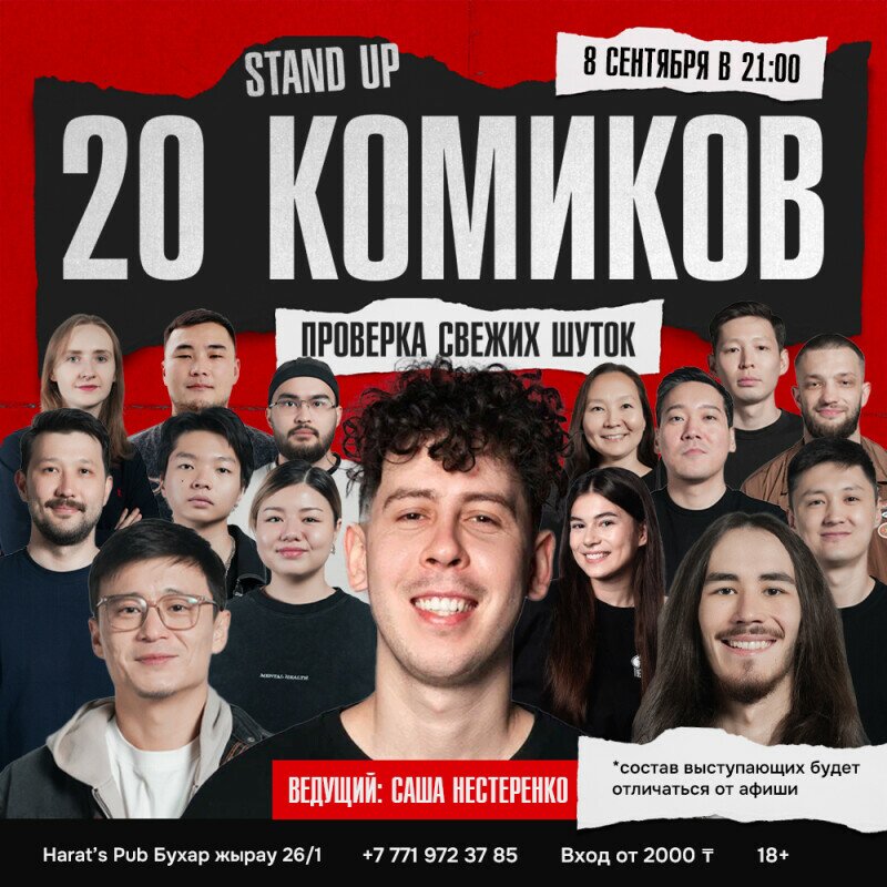 На одной сцене за вечер выступят 20 комиков и каждый принесет вам свой взгляд, стиль и свежие шутки.